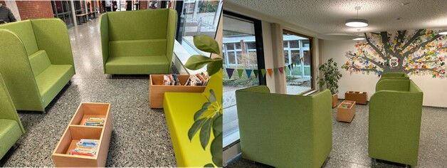 Dieser Bereich lädt sowohl in Pausen als auch im Unterricht zu gemütlichen Lesezeiten ein und bietet Raum für Bücher zum Ausleihen.