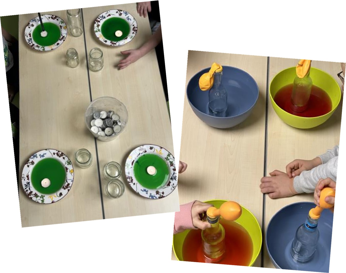 Die Kinder konnten experimentieren und an tollen Modellen erfahren, wie sich Luft ausdehnt, wie man eine Kerze mit Koh- lendioxid erstickt und haben wie weit selbstgebastelte Trinkhalmraketen fliegen.